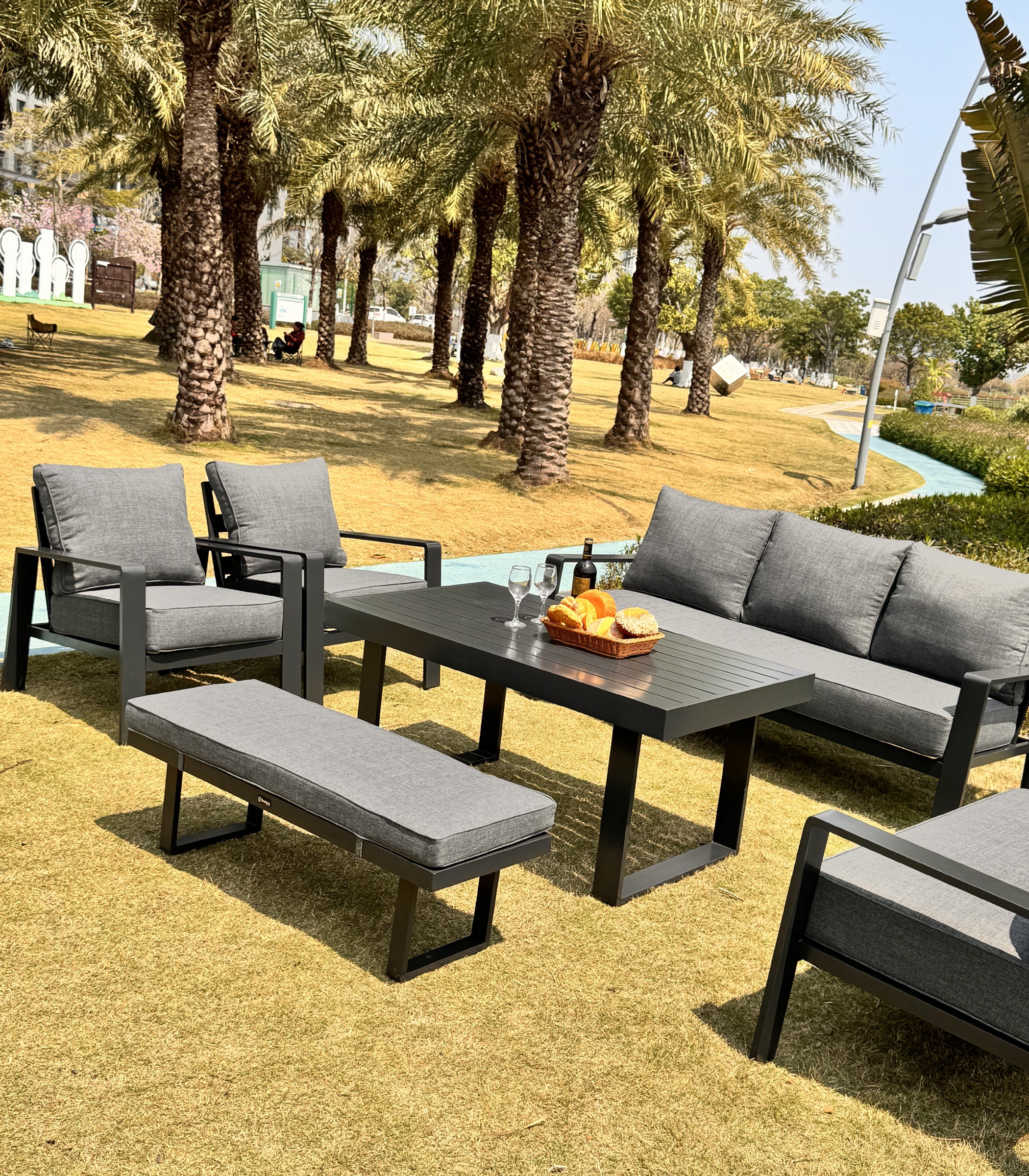 『Premium Aluminum Frame』: This 7 pcs outdoor patio furniture set is made of high quality aluminum, which is rustproof for years to come. Likewise, the aluminum material is more lightweight than other common metals, so you are able to move it with ease. And the adjustable non-slip foot pads fit uneven ground.